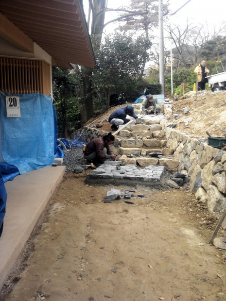 そして 名古屋市へ 2012/12/21 仕事風景 #石積み 名古屋市守山区 現場風景 庭は道路から建築に潜り込むような構成です 後に数寄屋門が付く階段の踊場と玄関前を石張りしています ザクッと積んだ石積みをピシッと敷く石張りでデザイン的に締めています
