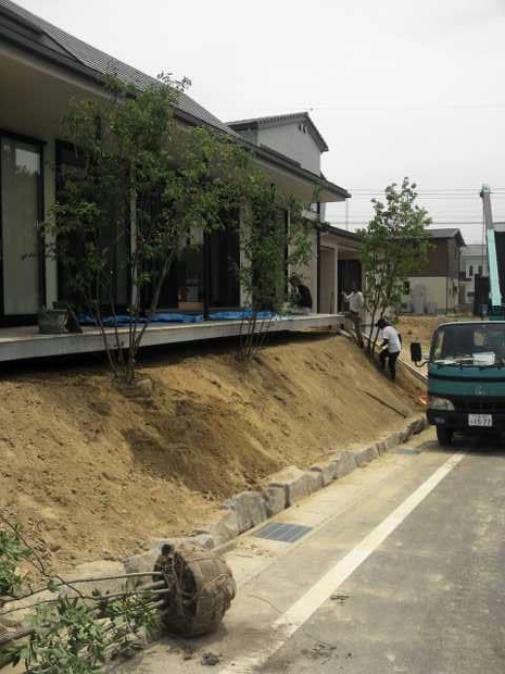 岡崎の作庭 植栽 2012/05/25 仕事風景 岡崎の作庭はいよいよ植栽です 今回は最小限の株数で景色を造って欲しいとの希望でした ならばと樹木は全部建物の中から見える所だけ 配置や向きも中から全部見て決めました 樹木が少なくなってその分下草が腕の見せ所ですね! 明日は下草を植え付けて仕上げです